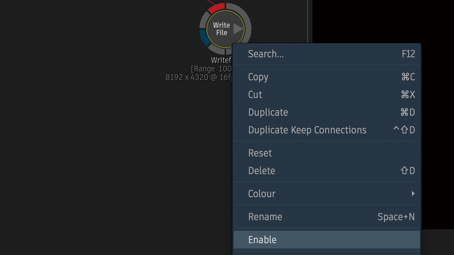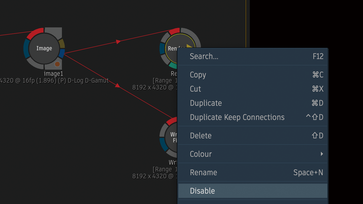 RenderノードとWritefileノードは、コンテキストメニューEnable/Disableオプションを使用してアクティブ化または非アクティブ化することができます。
